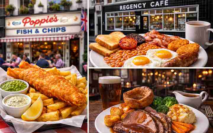 吃的方面,伦敦现在的餐饮选择极其丰富, 炸鱼薯条 (Fish & Chips),推荐复古风的 Poppies;想要丰盛的开局,去 Regency Cafe 吃一顿全英式早餐;周日则不可错过传统的周日烤肉 (Sunday Roast)
