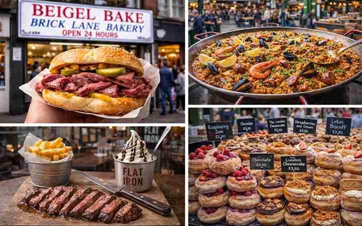 如果想吃平价食品,性价比之王首选 Flat Iron 的平价牛排(餐后送冰淇淋);想吃街头美食,直奔 波罗市场 (Borough Market) 吃炖饭甜甜圈;东伦敦的红砖巷有传奇的咸牛肉贝果 (Beigel Bake)